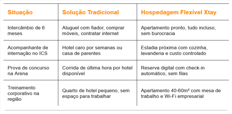 A hospedagem flexível da Xtay elimina as fricções típicas de aluguel temporário, permitindo que você foque no que realmente importa — seja estudar, cuidar de saúde, fazer uma prova ou trabalhar.