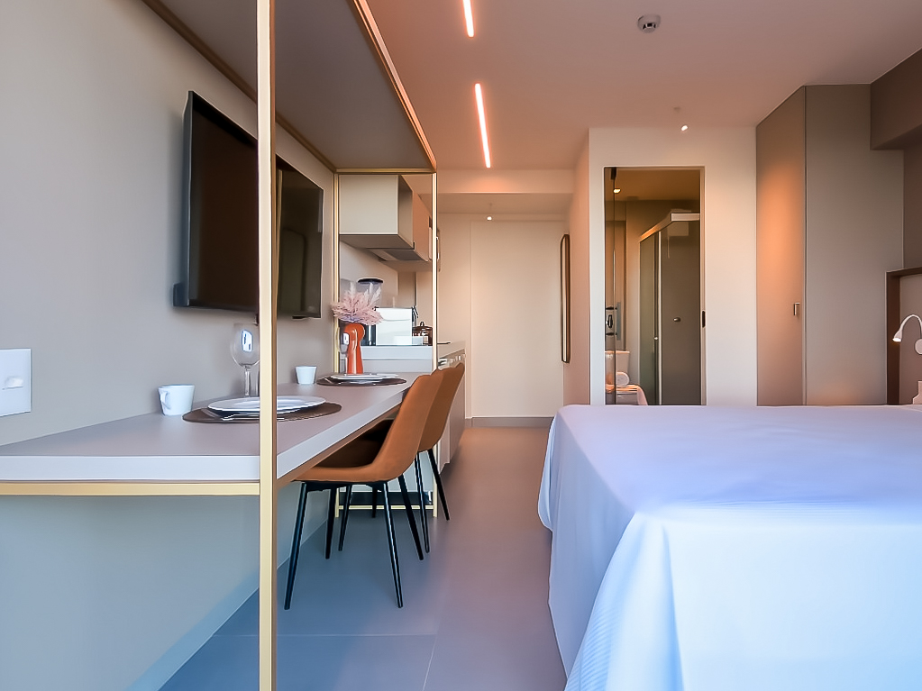 Imagine viver com o mar como extensão do seu quintal. Nossos estúdios, entre 17 m² e 38 m², são totalmente mobiliados e contam com piscina, academia e uma estrutura pensada para você relaxar com estilo à beira-mar. O prédio dispõe de um mercadinho autônomo no térreo e acesso direto ao litoral ideal para quem busca unir conforto e natureza.